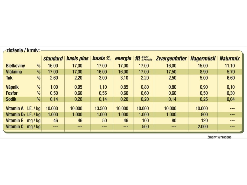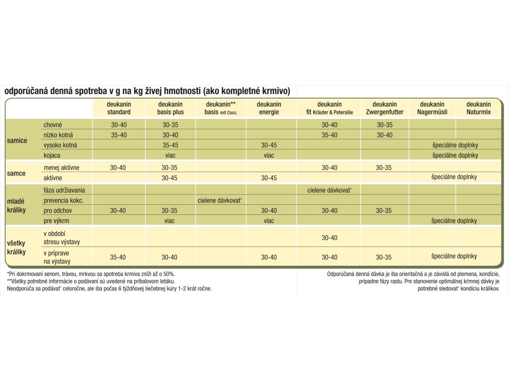 Doplnkové, ochutené krmivo pre králiky a hlodavce v podobe mixu musli, granúl a zrnín. Toto krmivo je obohatené o vitamín C a preto je veľmi vhodným pre mladé kategórie králikov a morčiat. Nakoľko má znížený obsah energie a znížený podiel tukov je veľmi vhodným doplnkovým krmivom pre prípravu králikov na výstavy a chovnú sezónu. Zároveň je ideálnym krmivom pre zdrobnených králikov, morčatá a škrečky.