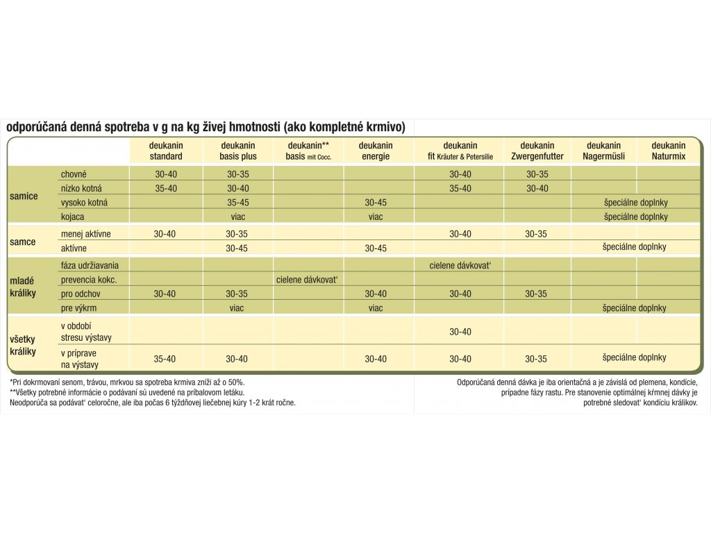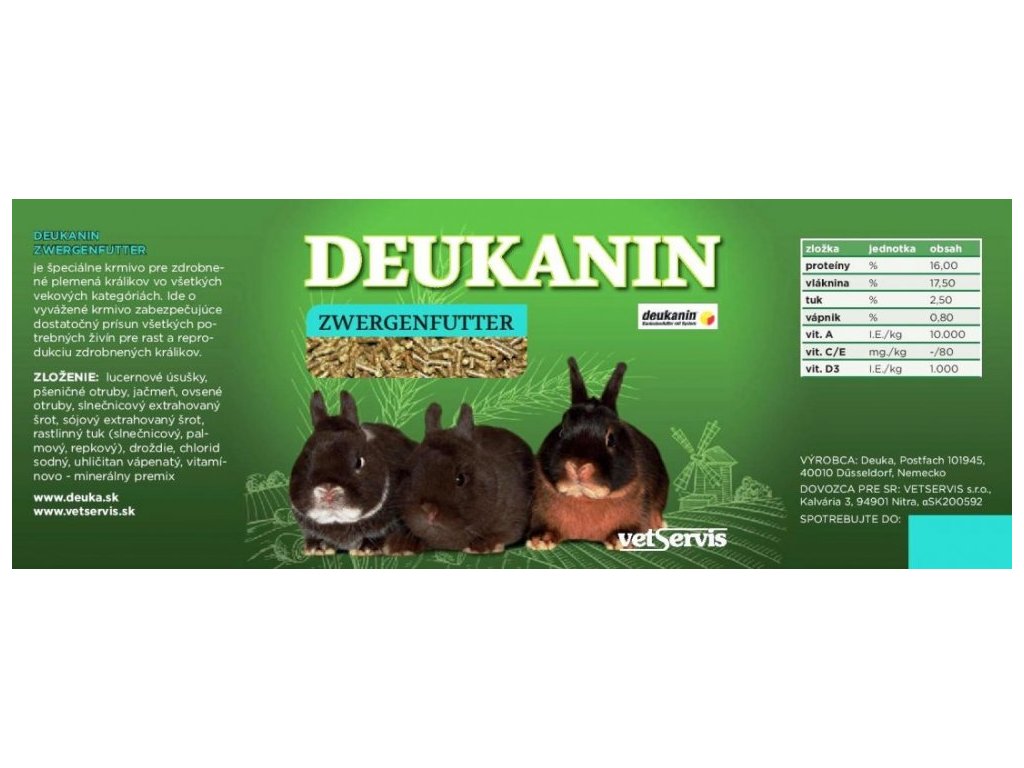 Špeciálne krmivo pre zdrobnené a malé plemená králikov. Krmivo má dokonale vyvážené zastúpenie jednotlivých živín tak, aby mali králiky výbornú kondíciu a pritom, netrpeli prerastaním a nadváhou. Deukanin zwergenfutter je vhodným krmivom na úspešný odchov a chov malých a zdrobnených plemien králikov. Znížený obsah energie a obsah škrobu uľahčuje chovateľovi predchádzanie nežiaducej obezite. Zvieratá napriek tomu prichádzajú na výstavu v špičkovej forme.
