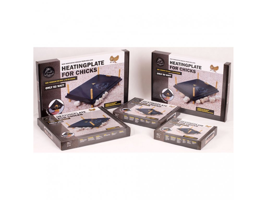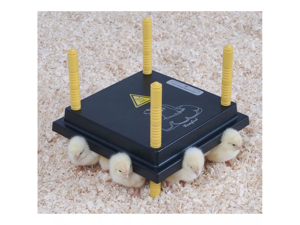 Výhrevná doska pre kurčatá s regulátorom teploty. Samostatne stojaca výhrevná doska pre kurčatá s regulátorom teploty na nožičkách. Nastavením teploty za pomoci regulátora zabezpečuje konštantnú teplotu potrebnú na bezproblémový odchov kurčiat. Úsporný chod v porovnaní s klasickými žiarovkami.